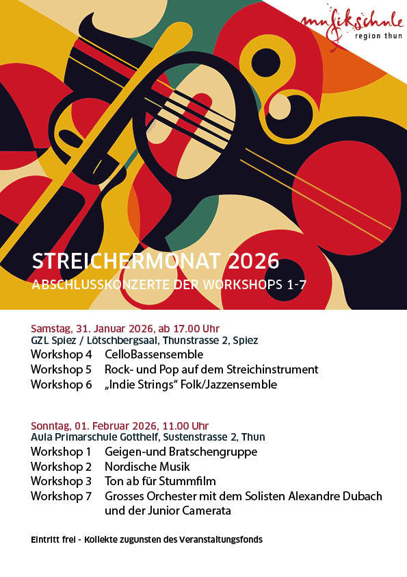 Im Streichermonat stellen wir das gemeinsame Musizieren in den Mittelpunkt. Ein Instrument spielen macht Spass - das Zusammenmusizieren macht glücklich. Die Streicherlehrpersonen der Musikschule Region Thun freuen sich sehr euch Schülerinnen und Schülern die Workshops des Streichermonats präsentieren zu dürfen. Es erwartet euch eine bunte Palette an unterschiedlichen Mitspielmöglichkeiten.